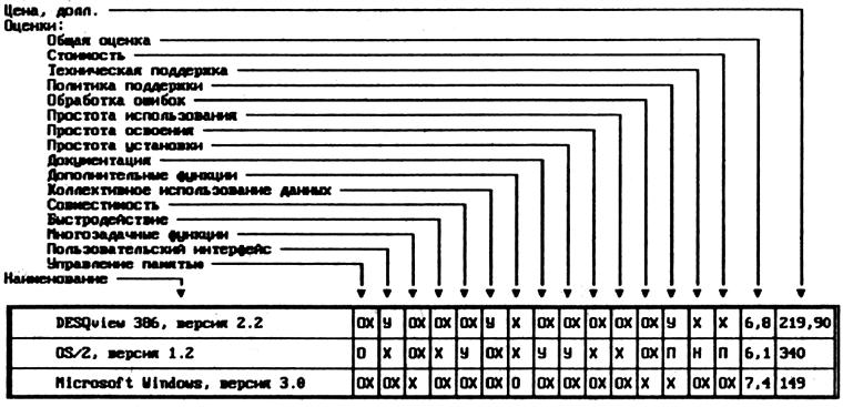В табл. 4.2 на качественном уровне представлены основные характеристики интерфейсных систем Windows и DESQview, а также функционально аналогичной им системы OS/2, заимствованные из журнала «Мир ПК». Здесь использована и в дальнейшем будет применяться следующая оценочная шкала: О — отлично, ОХ — очень хорошо, X — хорошо, У — удовлетворительно, П — плохо, Н — неудовлетворительно. Приведенные оценки (но в числовом выражении) умножены на веса соответствующих характеристик и все полученные числа для каждой системы просуммированы. Таким образом определена общая оценка, которая свидетельствует о превосходстве Windows 3.0. Вместе с тем OS/2 выгодно отличается средствами управления памятью, так как она управляет МП не в реальном, а в защищенном режиме, имеющем более емкое адресное пространство.