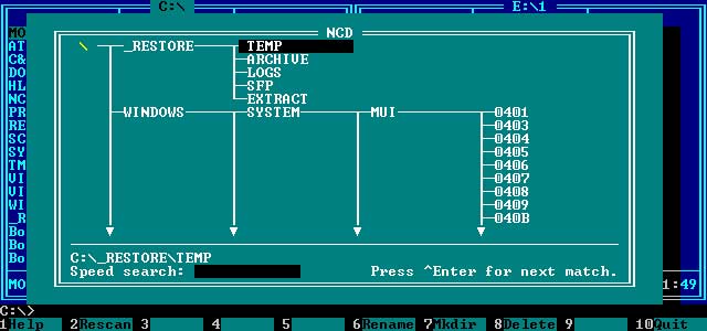 2. выбирать каталог (клавишей Enter), в результате чего окно NCD закрывается, а на активную панель выдается содержимое этого каталога (иными словами, осуществлять смену рабочего каталога);