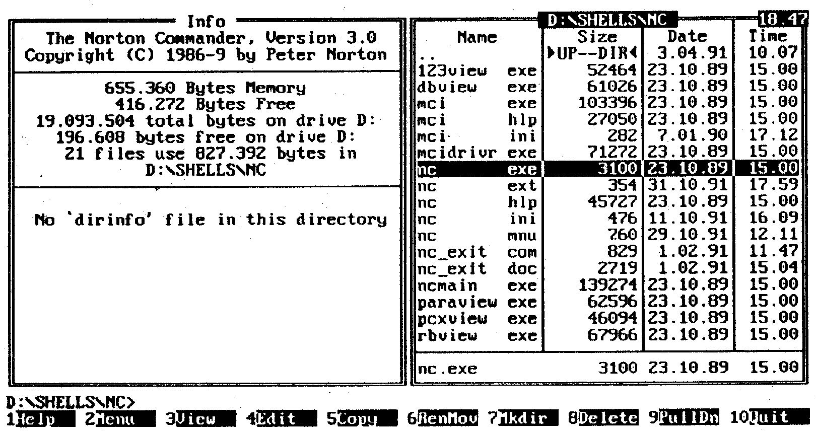 Оболочка Norton Commander разработана американской фирмой Peter Norton Computing, которая в 1990 г. Вошла в состав корпорации Symantec. Последняя версия этой оболочки (3.0) появилась на рынке в октябре 1989 г. И в настоящее время, пожалуй, среди оболочек DOS пользуется наибольшей популярностью, хотя и не является самой совершенной. Причины этого обсуждались в п. 4.3.2.