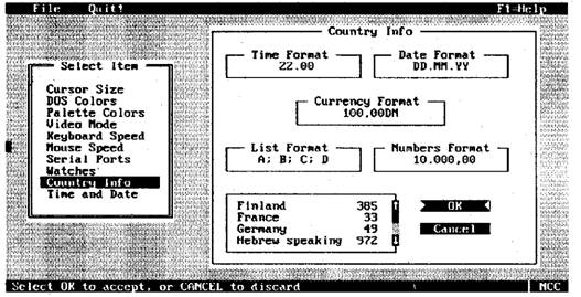 На ней показываются действующие в данный момент форматы времени (Time Format), даты (Date Format), денежной единицы (Currency Format), списка элементов (List Format) и чисел (Numbers Format). Если драйвер COUNTRY.SYS подключен к DOS командой DEVICE = через файл CONFIG.SYS или командой NLSFUNC, то пользователю