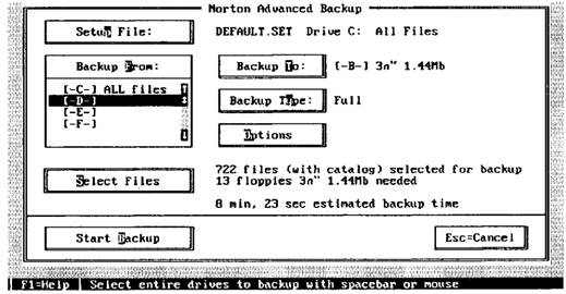1) выбрать файлы, подлежащие резервированию (с использованием области Backup From и команды Select Files);